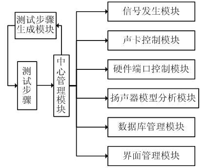 系統(tǒng)軟件采用模塊化設計方法,整個系統(tǒng)包含中心管理模塊、測試步驟生成模塊、聲卡控制模塊、信號發(fā)生模塊、揚聲器模型分析模塊、硬件端口控制模塊、數(shù)據(jù)庫管理模塊和界面管理模塊等等。其中中心管理模塊為核心部分,軟件運行時從該模塊進入,其它功能模塊均在該模塊的管理下,協(xié)調(diào)一致的工作。各功能模塊均有標準的數(shù)據(jù)接口,統(tǒng)一經(jīng)過中心控制模塊完成數(shù)據(jù)交換,彼此之間不獨自發(fā)生聯(lián)系,因此可以保證模塊的獨立性,為程序的維護和升級建立了良好基礎。各個模塊完成的功能如下所述:
