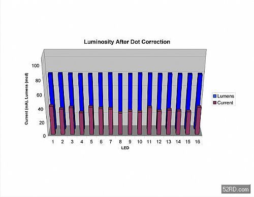 為了提供像點(diǎn)修正功能,制造商會透過畫面擷取測量每顆LED的亮度,再將系統(tǒng)最暗的LED指定為基準(zhǔn)LED,然后將其它像素的亮度調(diào)整成和基準(zhǔn)LED相同;調(diào)整方式則是根據(jù)LED輸出亮度將每個像素的電流減少一定比例。德州儀器(TI)的TLC5940或其它類似元件都會將每顆LED的像點(diǎn)修正值儲存在晶片內(nèi)建的EEPROM記憶體,或是在每個更新週期當(dāng)中做動態(tài)修改。這種雙重像點(diǎn)修正方式很有彈性,它既能在外界照明條件改變時更新整個面板的亮度,又能提供長期保存像點(diǎn)修正資訊以確保面板亮度均勻。只要像素亮度隨時間出現(xiàn)變化,或是面板因?yàn)楣收隙枰{(diào)整和更換,工程人員隨時都能更新EEPROM資料。我們將用下列例子來說明這種做法。