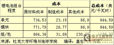 表1:鋰電池成本分析