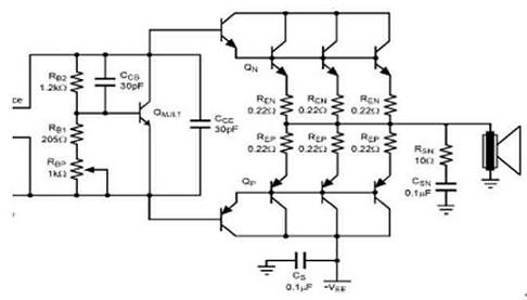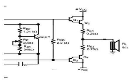 改善交越失真的最有效方法便是減少RE的電阻。對于相同數(shù)值的RE,一個平行形式的輸出可降低用來改善線性度的整體RE電阻值。同時,假如每一個級的RE都較大,那便可為輸出晶體管帶來更佳的匹配性和電流平衡。此外,RE也關(guān)系到輸出的功率損耗。對于一個相同的RE,較大的輸出電流會導致較大的功率損耗。RE的值取決于并聯(lián)輸出晶體管的數(shù)量和揚聲器的負載。建議采用足夠功率的0.1到0.5Ω電阻器。