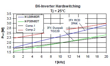 這個是25度損耗的時候,這個是175度損耗的時候,可以看到藍(lán)色的這根線,基本上它的損耗跟這個TO220封裝產(chǎn)品相差并不是很大。這個是在基于剛才基礎(chǔ)上做的一個損耗分析,首先頻率在4K赫茲的時候可以看到,這個淺藍(lán)色的就是二極管的開關(guān)損耗,這個是二極管的導(dǎo)通損耗,這個是IGBT的開關(guān)損耗,這個是IGBT的導(dǎo)通損耗??梢钥吹皆?K的情況下導(dǎo)通損耗這一部分和這一部分是占了絕對支配地位的。所以對于一個低頻應(yīng)用來說減少它的飽和導(dǎo)通壓降對于IGBT是相當(dāng)?shù)闹匾?,?dāng)它的頻率升高的時候,它的開關(guān)損耗就會稍微升高一點。