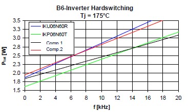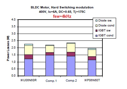 衡量一個IGBT的好壞有兩個非常重要的指標(biāo),一個就是它的飽和導(dǎo)通壓降,就是Vce(sat),另外一個就是開關(guān)損耗,也就是Eoff。對于低頻的應(yīng)用來說,飽和導(dǎo)通壓降是占有絕對支配地位的,所以選擇這種RC-Drives的IGBT會是一個非常好的選擇,因為可以看到這種RC-Drives IGBT的飽和導(dǎo)通壓降是遠(yuǎn)遠(yuǎn)低于市面上的一些產(chǎn)品。這個是在一個無刷電機上面的損耗的分析。