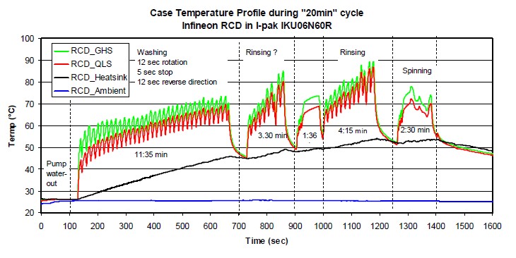 同時跟這種TO220的封裝的IGBT也做了一個溫度的比較,我們會發(fā)現(xiàn)TO220封裝的IGBT溫度會比逆向?qū)ㄐ虸GBT會低10度到15度,但是這個對于IGBT沒有任何影響。為什么呢?因為通常這種TO220的封裝的IGBT最高結(jié)溫是150度,而逆向?qū)ㄐ虸GBT是175度,所以它實際能力還是比這個要高,這是這種逆向?qū)ㄐ虸GBT的優(yōu)勢。為了進(jìn)一步來確認(rèn)一下這個溫度的應(yīng)力,然后我們把這個測試放在一個密閉的環(huán)境當(dāng)中再來看它的表現(xiàn),就是說我們來開動洗衣機使它的環(huán)境溫度平衡在40度這個環(huán)境上,就是從25度上升到40度,然后再來檢測IGBT的溫度,我們?nèi)匀豢梢园l(fā)現(xiàn)基本上它的最高溫度仍然沒有超過90度,所以對于一個結(jié)溫在175度的情況下,它有一個相當(dāng)大的裕量。