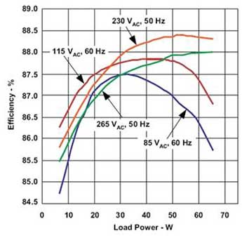 總之,更嚴(yán)格的節(jié)能標(biāo)準(zhǔn)要求創(chuàng)新的電源技術(shù),電源需要在整個(gè)負(fù)載范圍內(nèi)都有很高的效率,并可極大節(jié)約能源。基于負(fù)載條件,操作不同模式下的使用準(zhǔn)諧振控制和跳脈沖技術(shù)的反激式變換器可闡明它對(duì)AC/DC應(yīng)用中的節(jié)能進(jìn)行優(yōu)化的有效性。新開(kāi)發(fā)的IC(如TI推出的UCC28600)是符合新節(jié)能標(biāo)準(zhǔn)的最優(yōu)解決方案之一。圖3提供了效率的典型測(cè)試結(jié)果,而圖4則顯示了在連接于通用離線輸入(帶單一18Vdc輸出)的65W反激式變換器中使用UCC28600的準(zhǔn)諧振控制和跳脈沖技術(shù)的待機(jī)功率。