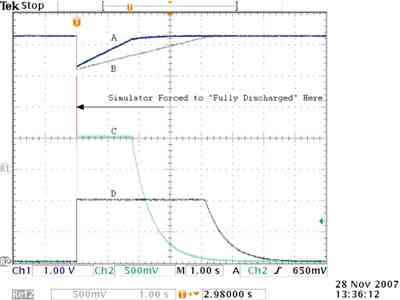 根據(jù)圖中給出的參數(shù)值,充電電流為1A時,積分時間常數(shù)使模擬電路在6至7秒內(nèi)達到充電器的4.2V限制。對電流范圍、內(nèi)阻、充電終止電壓和完全放電電壓的模擬是在鋰離子電池(本例中指SonyUS18650G3)典型參數(shù)的基礎(chǔ)上完成的。所仿真的電池電壓沒有考慮環(huán)境溫度的影響。