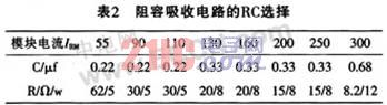 模塊過壓保護一般也可采用阻容吸收法。對于持續(xù)時間較短,能量不大的過電壓,一般可在模塊兩端并聯(lián)阻容吸收電路,用吸收電容把過電壓的電磁能量變成靜電能量存貯起來。而用吸收電阻不但可以防止電路振蕩,還可限制晶閘管導通時電容放電所產生的開通損耗和di/dt值。并聯(lián)在晶閘管開關模塊的RC值可參考表2。