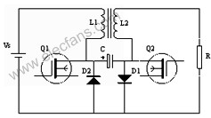 功率雙向流動(dòng)CUK變換器(圖2)與傳統(tǒng)的單向功率流動(dòng)CUK變換器不同的是:在原來開關(guān)管Q1和二極管D1兩端分別反向并聯(lián)二極管D2和開關(guān)管Q2如圖3所示。這個(gè)電路具有對(duì)稱性,輸入輸出電流方向可正可負(fù)。右邊負(fù)載R換為下正上負(fù)電壓源Vs,左邊電壓源Vs換為負(fù)載R,則功率從右向左倒流[2]。