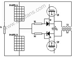 系統(tǒng)投入運(yùn)行后,假設(shè)Ua>Ub,電壓環(huán)比例積分調(diào)節(jié)器的輸出高電平封鎖Q2的驅(qū)動(dòng)電路,TL494的調(diào)制脈沖輸出端A(8腳)輸出PWM方波無效,只有Q1導(dǎo)通,功率從PANEL A流向PANELB,Ua下降,Ub上升,最終Ua=Ub。反之,Ua<Ub,電壓環(huán)比例積分調(diào)節(jié)器的輸出高電平封鎖Q1的驅(qū)動(dòng)電路,TL494的調(diào)制脈沖輸出端B(11)腳輸出PWM方波無效,只有Q2導(dǎo)通,功率從PANELB流向PANELA,Ua上升,Ub下降,最終亦Ua=Ub。
