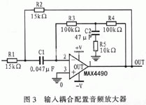 圖3所示音頻放大器采用了一種新穎的交流耦合方式,它與傳統(tǒng)的耦合電路配置相比只需要非常小的耦合電容器。圖中輸入電容器(C1)的容量僅為0.047μF。因此,我們可以采用電壓系數(shù)非常低的COG/1206陶瓷電容器這樣可以最大限度地降低電壓系數(shù)的影響。運算放大器(必須采用低偏置電流的放大器,例如MAX4490型)的直流反饋由兩個100kΩ的電阻器(R3和R4)組成,C2和R5用來衰減直流反饋環(huán)路的音頻頻率。主要音頻反饋元件為R1、R2和C1三個無源元件。根據(jù)圖中所示的元件值,該電路的-3db截止頻率設(shè)置在5Hz。