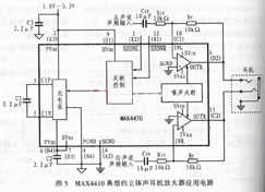 圖5所示MAX4410典型的立體聲耳機放大器應(yīng)用電路。設(shè)置輸入電容Cin等于10μF時能夠?qū)㈦娙萜麟妷合禂?shù)的影響限制到亞音頻頻率,該電路省略了大容量的輸出耦合電容器。