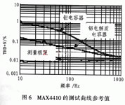 關(guān)于大容量電容器,圖6給出兩種100μF電容器和16電阻器組成的無源高通濾波器的THD+N與頻率的關(guān)系曲線。在100Hz、-3db截止頻率,兩種電容器的電壓系數(shù)均會導(dǎo)致THD指標(biāo)惡化。100μF的鉭電容器在-3db截止頻點THD+N指標(biāo)為0.2%。如果采用Maxim專有的DirectDrive放大器,因為省略了這個大容易輸出耦合電容器,可大大改進(jìn)低頻和音頻質(zhì)量。在圖6所示曲線中,MAX4410測試曲線近似等于參考值。