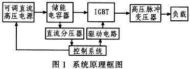 系統(tǒng)工作過程如下:由控制系統(tǒng)控制可調(diào)直流高壓電源給儲能電容器充電,當(dāng)充電電壓達到設(shè)定值后,再控制IGBT按照設(shè)定的頻率和脈沖寬度導(dǎo)通,產(chǎn)生脈沖電壓加在高壓脈沖變壓器原邊,最后由高壓脈沖變壓器升壓,產(chǎn)生所需的高壓脈沖加在負載上。