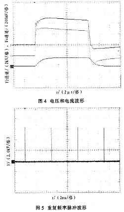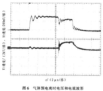 圖4中,縱坐標為電壓幅度值(2通道2kV/格,4通道200mV/格)。通道2為電壓波形,電壓約為5kV,脈沖寬度為10μs,上升沿小于lμs。通道4為電流波形,電流值約85A(波形圖中比例為l:500)。圖5中,脈沖周期為5ms,重復(fù)頻率為200Hz。圖6中,縱坐標為電壓幅度值(1通道5kV/格,2通道2V/格)。l通道為放電電壓波形,2通道為放電電流波形。從波形圖中可以看出,脈沖當(dāng)電壓加在氣體上時,大約經(jīng)過幾微秒時間后,氣體發(fā)生電離。此時由于分壓原因,電壓幅值略有下降,電流波形開始出現(xiàn)。在脈沖電壓加載期間,氣體維持了電離狀態(tài)。