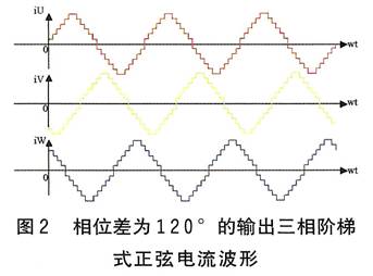 以上分析表明,對于三相永磁同步電機(jī),當(dāng)三相繞組輸入三相對稱的正弦電流時,由于在內(nèi)部產(chǎn)生圓形旋轉(zhuǎn)磁場,電機(jī)的輸出轉(zhuǎn)矩為恒值。因此,將交流伺服控制原理應(yīng)用到三相混合式步進(jìn)電機(jī)驅(qū)動系統(tǒng)中,輸入的220V交流,經(jīng)整流后變?yōu)橹绷鳎俳?jīng)脈寬調(diào)制技術(shù)變?yōu)槿冯A梯式正弦波形電流(見圖2),它們按固定時序分別流過三路繞組,其每個階梯對應(yīng)電機(jī)轉(zhuǎn)動一步。