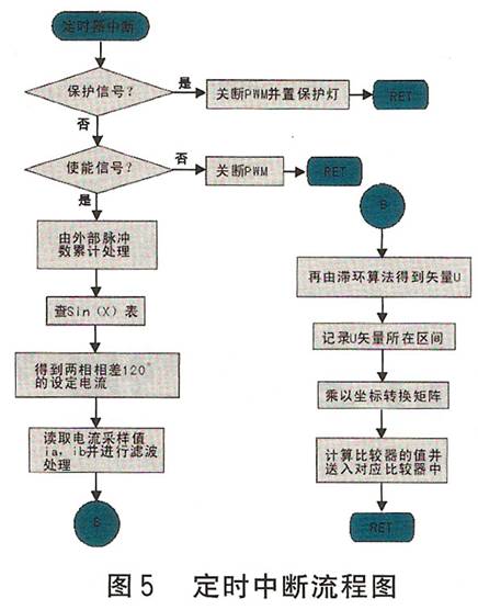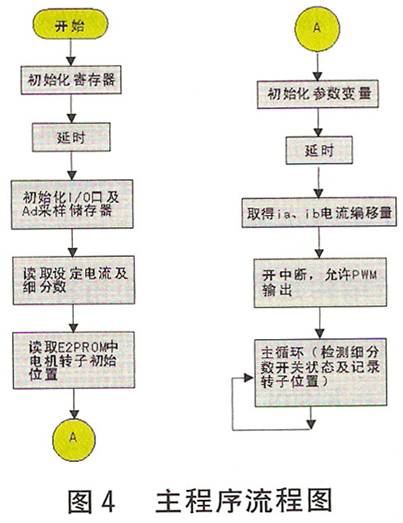 圖4示出主程序流程圖,圖5示出定時中斷流程圖。為減少功耗和保護(hù)電機(jī),設(shè)置了自動半電流功能(靜態(tài)鎖軸或沒有脈沖輸入時電流減半),它由滯環(huán)比較器自動進(jìn)行調(diào)節(jié)。