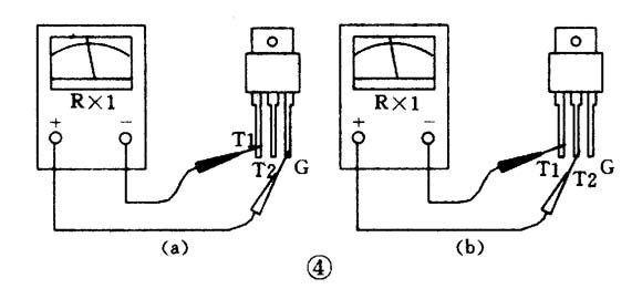 (2)把黑表筆接T1極,紅表筆接T2極,電阻為無窮大。接著用紅表筆尖把T2與G短路,給G極加上負觸發(fā)信號,電阻值應為十歐左右(參見圖4(a)),證明管子已經(jīng)導通,導通方向為T1一T2。再將紅表筆尖與G極脫開(但仍接T2),若電阻值保持不變,證明管子在觸發(fā)之后能維持導通狀態(tài)(見圖4(b))。