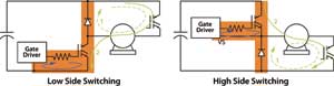目前,大功率半導體器件(如IGBT和MOSFET)的發(fā)展趨勢是在提升性能的前提下不斷縮小芯片尺寸。減小芯片尺寸能減少器件的寄生電容,從而提高開關速率。因此,深入研究電路板上的關鍵回路越來越重要。圖1為電壓源變頻器(voltagesourceinverter,VSI)的兩種典型開關工作方式的簡化示意電路。在開關頻率受限的大電流應用中,IGBT是最受歡迎的器件。上圖所示為從高壓側(HS)續(xù)流二極管到低壓側IGBT的換流。電流最初是在高壓側二極管和相應反相半橋的IGBT形成的續(xù)流通道中。