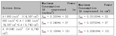 表1:ENERGYSTARV3.0版本對(duì)高清電視最大功耗的定義。