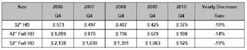 表3:DisplaySearch對(duì)LCDTV成本的近年數(shù)據(jù)統(tǒng)計(jì)及未來走勢(shì)預(yù)測。