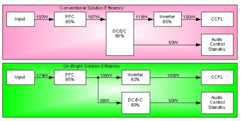 圖6以150WLCDTV電源為例來對(duì)比傳統(tǒng)方案與昂寶電子方案,假設(shè)背光滿載消耗100W,其它部分滿載消耗50W,按照常規(guī)架構(gòu)及各模塊轉(zhuǎn)換效率來推算,運(yùn)用傳統(tǒng)方案來設(shè)計(jì),其理論輸入功率將達(dá)到197W左右,整體效率為76%,而使用昂寶電子的方案來設(shè)計(jì),理論輸入功率只需要174W左右,整體效率高達(dá)86%。