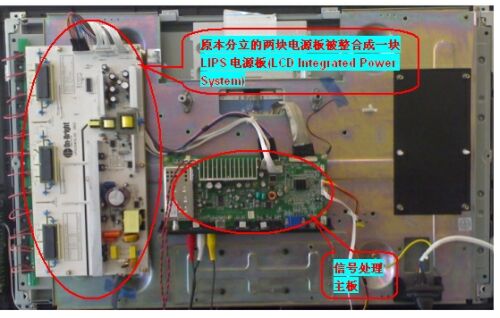 圖2:傳統(tǒng)式LCDTV內(nèi)置信號(hào)處理、AC/DC電源、DC/AC電源三塊PCB板。