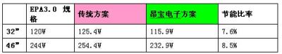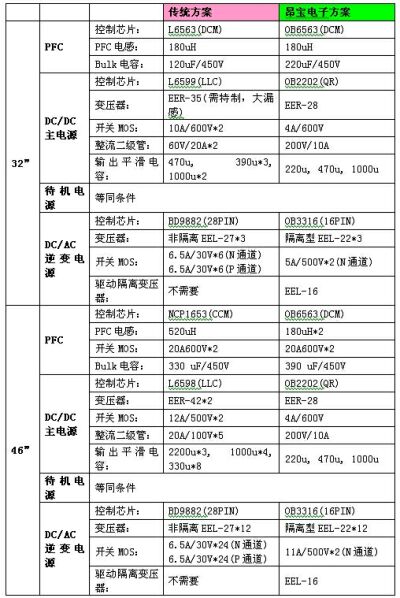 以某知名品牌32"與46"LCDTV進(jìn)行對(duì)比,昂寶電子所開發(fā)的LCDTV整體電源解決方案在整體功耗及關(guān)鍵零件數(shù)量方面均比傳統(tǒng)電源方案有明顯的優(yōu)勢(shì):