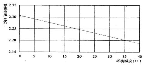 在電源系統(tǒng)中,電池總是在線(xiàn)備用工作的,這樣電池基本處于長(zhǎng)期的浮充狀態(tài)中,浮充電壓的選取對(duì)電池的長(zhǎng)期可靠運(yùn)行起著至關(guān)重要的作用。正如前面看到的,偏高的浮充電壓會(huì)造成電池緩慢失水并產(chǎn)生熱失控而使電池失效;偏低的浮充電壓會(huì)造成電池長(zhǎng)期處于充不飽電的狀態(tài),使電池發(fā)生硫酸化而導(dǎo)致電池失效。正確的浮充電壓一般應(yīng)選在2.23V-2.25V/單體,并應(yīng)隨同電池工作溫度進(jìn)行相應(yīng)調(diào)整。由于電池生產(chǎn)廠(chǎng)家的不同,這一參數(shù)會(huì)有一些差異,應(yīng)嚴(yán)格按照廠(chǎng)家提供的參數(shù)選取。圖1是某廠(chǎng)家電池浮充電壓同溫度的關(guān)系曲線(xiàn)。