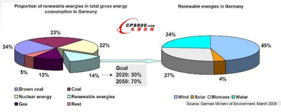 歐洲是現(xiàn)代能源和氣候政策的先驅(qū),德國(guó)是利用新能源技術(shù)方面一個(gè)最好的例證。鑒于到2020年,要實(shí)現(xiàn)減少14%的二氧化碳排放量(與2005年的排放量相比)的目標(biāo),到2020年可再生能源在初級(jí)能源消耗中的比例要增加到18%(2005年為6%)。對(duì)于德國(guó)總電力消費(fèi)來(lái)說(shuō),這意味著到2020年可再生能源的份額將增加一倍,如圖2所示。展望未來(lái),到2050年計(jì)劃可再生能源的份額達(dá)到70%。