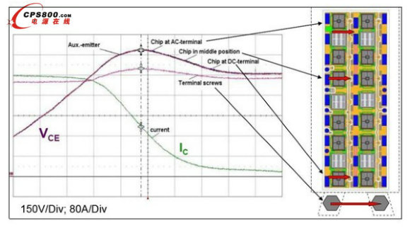 最后一點(diǎn)值得考慮的是新SKiM模塊的內(nèi)部機(jī)械設(shè)計(jì)。圖6顯示了標(biāo)有芯片位置的陶瓷襯底的布局。要注意布局的高度對(duì)稱性。在右側(cè)可以看到同時(shí)也扮演機(jī)械壓接系統(tǒng)角色的內(nèi)部功率母線。層狀母線和流經(jīng)每個(gè)芯片的電流直接使得DC+和DC端子之間的雜散電感不到20nH。至于IGBT的關(guān)斷,對(duì)于不同位置的芯片,沒(méi)有發(fā)現(xiàn)任何的差別。