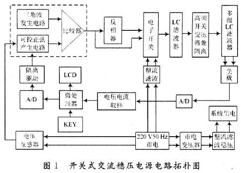 電壓和電流取樣電路從負載上獲取電壓和電流信號,分別送兩路A/D轉(zhuǎn)換器轉(zhuǎn)換,變成離散的數(shù)字信號。一方面用于通過微處理器處理后進行實時顯示;另一方面用于通過微處理器處理后送D/A轉(zhuǎn)換器變換為模擬量,經(jīng)過光電隔離驅(qū)動電路來控制正弦波發(fā)生器的幅值,又經(jīng)過比較器、反向器、高速電子開關(guān)、LC濾波、高頻開關(guān)變壓器、多級LC濾波等電路,用于控制負載上電壓或電流的穩(wěn)定。電壓互感器的作用是從市電中獲得低諧波失真的標(biāo)準(zhǔn)正弦波,經(jīng)由正弦波產(chǎn)生電路控制其幅值;鍵盤用于輸入準(zhǔn)備向負載提供的電壓或電流值。