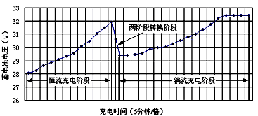 使用該蓄電池充電器對某型號(hào)航空蓄電池進(jìn)行了充電試驗(yàn),最大充電電流限制為30A,溫度限制值定為350C。蓄電池的初始電壓為20V,充電開始時(shí),充電器以20A的電流對蓄電池持續(xù)充電約58分鐘,然后以較小的電流3A對蓄電池進(jìn)行涓流充電,直至蓄電池電壓上升到32.45V時(shí),蓄電池兩端的電壓不再發(fā)生明顯的上升現(xiàn)象,此時(shí)充電器停止充電,歷時(shí)150分鐘,充電過程曲線示意圖如圖6所示。