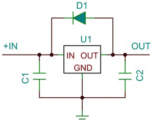 另一個(gè)動(dòng)態(tài)性能變量是輸出噪聲。通過(guò)增加穩(wěn)壓器輸出端的濾波器電容一般可以降低輸入紋波和輸出噪聲,但是會(huì)延長(zhǎng)瞬態(tài)恢復(fù)時(shí)間。線性穩(wěn)壓器的運(yùn)行依賴于一個(gè)內(nèi)部增益級(jí)。為了防止該增益級(jí)出現(xiàn)振蕩,通常會(huì)需要一個(gè)最小輸出濾波器電容(請(qǐng)參見(jiàn)圖1中的C2)。一個(gè)輸入濾波器電容(請(qǐng)參見(jiàn)圖1中的C1)將有助于穩(wěn)壓器服務(wù)于瞬態(tài)負(fù)載,尤其是在穩(wěn)壓器遠(yuǎn)離電源時(shí)更需要這樣一個(gè)輸入濾波器電容。許多穩(wěn)壓器都不容許存在反向電壓。如果輸出電容被充電至輸出電壓,同時(shí)輸入短路至接地,那么穩(wěn)壓器將出現(xiàn)反向電壓,并且在所有電路獲得放電以前穩(wěn)壓器都會(huì)鎖閉在某種未知狀態(tài)中。這種故障狀態(tài)可能會(huì)引起穩(wěn)壓器自毀。為了避免出現(xiàn)這種故障模式,可能會(huì)需要一個(gè)反向二極管鉗位(請(qǐng)參見(jiàn)圖3)。