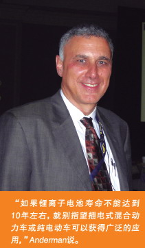 “如果鋰離子電池壽命不能達到10年左右,就別指望插電式混合動力車或純電動車可以獲得廣泛的應用,”Anderman說。