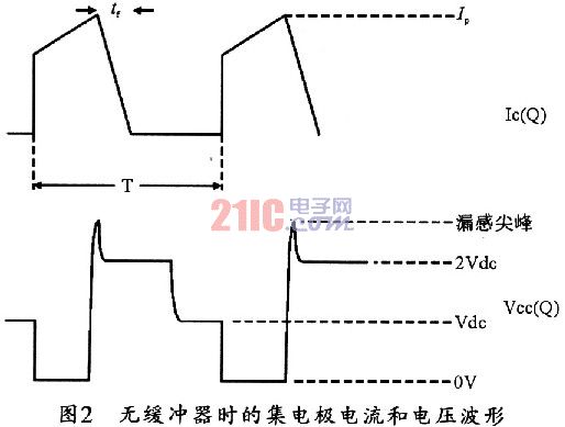 假設開關管沒帶緩沖電路,圖1所示的正激變換器的復位繞組和初級繞組匝數(shù)相同。這樣,當Q關斷瞬間,儲存在勵磁電感和漏感中的能量釋放,初級繞組兩端電壓極性反向,正激變換器的開關管集電極電壓迅速上升到2Vdc。同時,勵磁電流經(jīng)二極管D流向復位繞組,最后減小到零,此時Q兩端電壓下降到Vdc。圖2所示是開關管集電極電流和電壓波形??梢?,開關管不帶緩沖電路時,在Q關斷時,其兩端的漏感電壓尖峰很大,產(chǎn)生的關斷損耗也很大,嚴重時很可能會燒壞開關管,因此,必須給開關管加上緩沖電路。