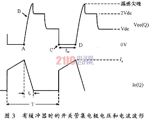 當開關管帶緩沖電路時,其集電極電壓和電流波形如圖3所示(以正激變換器為例)。