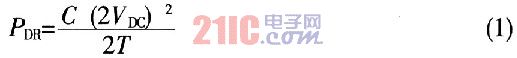電容C的大小不僅影響集電極電壓的上升速度,而且決定了電阻R上的能量損耗。在Q關斷瞬間,C上的電壓為2Vdc,它儲存的能量為0.5C(2Vdc)2焦耳。如果該能量全部消耗在R上,則每周期內(nèi)消耗在R上的能量為: