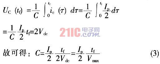 事實上,當Q開始關斷時,假設最初的峰值電流Ip的一半流過C,另一半仍然流過逐漸關斷的Q集電極,同時假設變壓器中的漏感保持總電流仍然為Ip。那么,通過選擇合適的電容C,以使開關管集電極電壓在時間tf內(nèi)上升到2Vdc(其中tf為集電極電流從初始值下降到零的時間,可以從開關管數(shù)據(jù)手冊上查詢),則有: