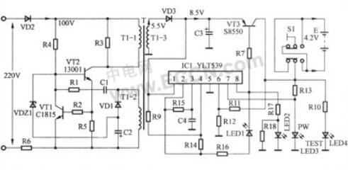 該電路主要由一塊軟塑封集成塊IC1(YLT539)和三極管VT3等組成。從變壓器T的1-3繞組感應(yīng)出的交流電壓5.5V經(jīng)二極管VD3整流、電容C3濾波后,輸出一個直流8.5V左右電壓(空載時),該電壓一部分加到三極管VT3的e極;另一部分送到軟塑封集成塊IC1(YLT539)的1腳,為其提供工作電源。集成塊IC1有了工作電源后開始啟動工作,在其8腳輸出低電平充電脈沖,使三極管VT3導(dǎo)通,直流8.5V電壓開始向電池E充電。