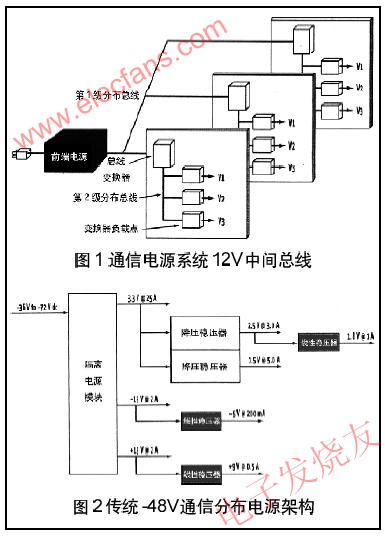 [page]圖2示出dc-dc隔離電流模塊和POL負(fù)載點(diǎn)變換器如何配置成典型的分布電源系統(tǒng),提供多輸出電壓和電流。來自前端ac-dc電源的DC電壓(-36~-72V)饋入一個(gè)隔離的電源模塊,此模塊代表一個(gè)總線變換器。模塊完全是隔離ac-dc變換器,有不同的形式(全磚、半磚、1/4磚),具有標(biāo)準(zhǔn)的占位面積,引腳輸出和散熱能力。POL變換器可以是開關(guān)穩(wěn)壓器(降壓或升壓穩(wěn)壓器)和線性穩(wěn)壓器的組合或僅是線性穩(wěn)壓器,這取決于所供電的電路要求。靈敏電路需要低噪聲線性穩(wěn)壓器,而高效率開關(guān)穩(wěn)壓器是必須有最小功耗的電源系統(tǒng)的選擇。