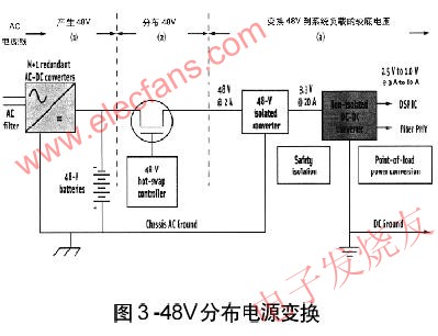 圖3示出電信應(yīng)用的-48V分布電源系統(tǒng)框圖,該圖說明了電源從輸入ac線到低電壓dc-dcPOL變換器的過程,電池(48V)為電源失效時(shí)備份ac-dc變換器。-48V熱交換控制器(IC)在帶電插撥電路板時(shí),為電源連接提供智能控制,這包括侵入電流控制,短路保護(hù)和保護(hù)電源系統(tǒng)的其他保護(hù)功能。第一個(gè)dc-dc變換級(jí)是一個(gè)隔離變換器,這意味著輸入dc電源地與輸出ac電源地是隔離的,通常采用變換器隔離,隔離是限定的,防止在失效條件下所呈現(xiàn)危險(xiǎn)電壓電平危害人。然而,隔離電路使變換器比較貴并對(duì)效率有影響。為系統(tǒng)單元電路提供電源的POL變換器不需要隔離,因?yàn)樗鼈冇蔀槠涮峁ヾc輸入電源的隔離電源模塊保護(hù)。