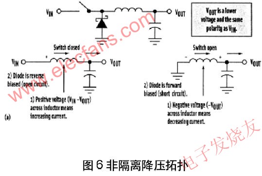 降壓變換器是構(gòu)成大多數(shù)開關(guān)變換器架構(gòu)基礎(chǔ)的基本拓?fù)?。它是最通用的拓?fù)?,在分布電源系統(tǒng)中會(huì)用到這種拓?fù)?,因?yàn)楸仨氉儞Q高dc電壓(48V)到較低的電壓,而且功耗小。開關(guān)是一個(gè)功率晶體管(通常是MOSFET),其柵極由執(zhí)行脈寬調(diào)制(PWM)的IC驅(qū)動(dòng)它控制占空比(晶體管的開關(guān)時(shí)間),從而控制輸出電壓大小。圖6示出非隔離降壓拓?fù)洹?br />