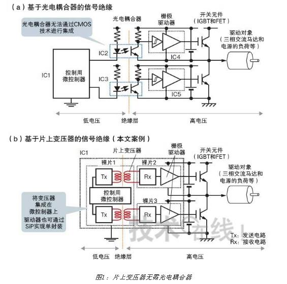 在絕緣型開關電源和交流馬達的驅動電路中,PWM信號等的絕緣一直使用光電耦合器(a)。如果能夠使用片上變壓器的話,就可以集成在微控制器上,因此可以大幅削減部件個數(shù)(b)。圖是根據(jù)瑞薩電子的資料制作而成的。