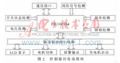 智能型雙電源開關(guān)控制器以單片機PIC16F884為核心,對兩路供電電源(常用電源和備用電源)的電壓、頻率和相位進行實時檢測。當其中一路電源(常用電源或備用電源)的電壓發(fā)生過壓、欠壓或是缺相時,控制器就會發(fā)出電機切換命令,使供電電源自動切換到另一路電源(備用電源或常用電源)上,以此來保障供電的連續(xù)性。控制器的工作方式主要有自動方式和手動方式兩種。控制器的結(jié)構(gòu)框圖如圖1所示,組成模塊如圖2所示。