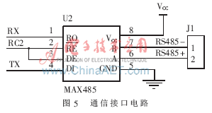 為了使控制器能夠方便地與上層控制平臺進行聯(lián)網(wǎng)通信,實現(xiàn)控制器的遠程控制、遠程監(jiān)控等功能,本設(shè)計為控制器添加了通信接口,采用簡單經(jīng)濟、廣泛應(yīng)用于工業(yè)上的RS485總線與外界進行通信。RS485采用差分信號進行傳輸,有較好的抗干擾能力,通過轉(zhuǎn)換模塊很容易實現(xiàn)從RS485到RS232的信號轉(zhuǎn)換,從而便于和上位計算機通信。選用了Maxim公司的MAX485芯片作為通信控制的主要器件,其工作電源為+5V,采用半雙工通信方式,能夠?qū)TL電平轉(zhuǎn)換為RS485電平,內(nèi)部包含了1個驅(qū)動器和1個收發(fā)器,通過串口可以方便地與PIC16F884進行通信。MAX485的接口電路如圖5所示。