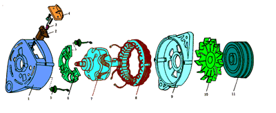 11管交流發(fā)電機(jī)的整流器由8只大功率整流二極管(其中2只中性點二極管)和3只磁場二極管組成。其它結(jié)構(gòu)和6管交流發(fā)電機(jī)相同。