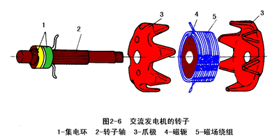 轉(zhuǎn)子由爪極、磁軛、磁場繞組、集電環(huán)、轉(zhuǎn)子軸組成,見圖2-6