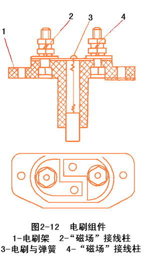后端蓋上裝有電刷組件,有電刷、電刷架和電刷彈簧組成。電刷的作用是將電源通過集電環(huán)引入磁場繞組。見圖2-12
