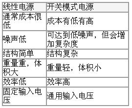 與傳統(tǒng)的線性電源相比,開關(guān)電源具有許多優(yōu)點。在通常情況下,如果只需要一個直流輸出,采用一個變壓器、整流器和濾波電容就可構(gòu)成線性電源。有時,可采用一個線性穩(wěn)壓器提供穩(wěn)壓輸出。這種系統(tǒng)的主要優(yōu)點是簡單,所以成本通常較低。而開關(guān)電源通常結(jié)構(gòu)復(fù)雜、價格昂貴,所以線性電源獲得了廣泛應(yīng)用。表1列出了兩種系統(tǒng)的優(yōu)點和缺點。