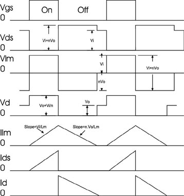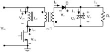 [page]當開關(guān)閉合時,電壓施加在變壓器初級的兩端,因為此時次級二極管是截止的,變壓器所起的作用就像電感器。經(jīng)過初級線圈的電流會上升,同時能量儲存在磁通量中。當開關(guān)斷開時,次級二極管導通,電流通過次級時會下降,因為能量被轉(zhuǎn)換至次邊大容量電容器。如果電流經(jīng)過磁化電感區(qū)后降至零,這是不連續(xù)導通模式。如果磁化電流未降至零,如圖3所示,則系統(tǒng)以連續(xù)導通模式工作。