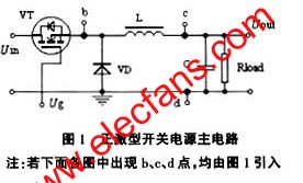 一般來講,正激型開關(guān)電源主電路可用圖1所示的降壓斬波器簡化表示,Ug表示控制電路的PWM輸出驅(qū)動信號。根據(jù)選用不同的PWM反饋控制模式,電路中的輸入電壓Uin、輸出電壓Uout、開關(guān)器件電流(由b點引出)、電感電流(由c點引出或d點引出)均可作為取樣控制信號。
